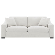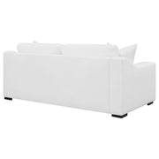 Transform your living room into a clean, contemporary interior with this cheerful, transitional sofa, upholstered in a crisp white trillium polyester blend performance fabric across elegant sloped track armrests and reversible box seat and back cushions with sophisticated top stitching detail. Block style legs in a bold cappuccino finish lend a striking contrast and continue into the solid wood frame that offers additional support and stability. Matching accent pillows present extra comfort and tie it all together. Key Features: • Soft sloped, wide track arms • Relax in trillium filled cushions that create a down-like seating comfort • Reversible seats and backs • Boxed seat and back cushions with top stitching for a tailored look • Wide solid wood legs in cappuccino complement the arm width