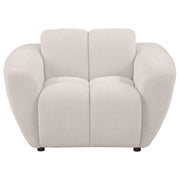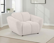 This sculptural accent chair from the Destino collection makes a bold statement with its wide splayed arms and chunky channel-tufted upholstery. Covered in soft greige chenille, it features a plush attached waterfall seat built with pocket coil construction for support that lasts. The grid-like contouring adds dimensional appeal, while its low, padded profile invites deep lounging. A modern silhouette grounded in comfort, it's the perfect standalone piece or complement to the full set. Key Features: • Sculptural accent chair with splayed arms and channel-tufted upholstery in soft greige chenille • Attached waterfall seat includes pocket coil construction for comfort and lasting support • Chunky contours and grid-style padding create bold volume and visual texture • Chenille fabric offers a smooth hand with subtle texture and tonal dimension • Low-profile frame provides lounge-ready comfort in a bold modern silhouette • Constructed from rubberwood, plywood, and foam for durable everyday use