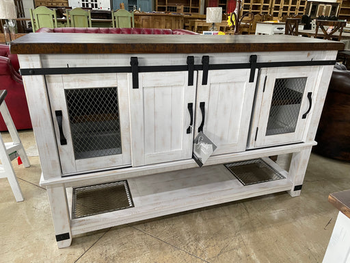 To those with an appetite for rustic farmhouse living, this server dishes out irresistible form and function. A pair of cabinet doors with mesh wir...