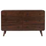 Keep your space neat and organized with this sleek mid-century modern dresser, built with pine, engineered wood, and walnut veneer for durability. Featuring six spacious drawers, it offers ample storage for clothing and accessories. Rounded edges and tapered legs exude retro charm, while the felt-lined top drawers add functionality for storing delicate items. The clean, modern silhouette is perfect for enhancing any bedroom's aesthetic. Key Features: • Six-drawer dresser with a dark walnut finish for timeless appeal • Rounded edges and tapered legs highlight mid-century modern design • Felt-lined top drawers safeguard delicate belongings • Pine, engineered wood, and walnut veneer construction ensures durability • Smooth drawer glides for seamless storage and access • Sleek silhouette enhances any bedroom’s organization