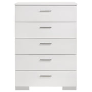 Maximize bedroom storage with this modern 5-drawer chest, designed with clean lines and a streamlined silhouette. A bright white high gloss finish creates a crisp, contemporary look, while chrome-finished handles and feet add a touch of refinement. Each drawer glides smoothly on metal extension hardware, offering easy access and reliable support. Built for everyday use, this chest delivers both function and polished style. Key Features: • Modern 5-drawer chest featuring a sleek and vertically oriented silhouette • White high gloss finish delivers a bright, crisp, and polished contemporary look • Five generously sized drawers offer ample storage for clothes and accessories • Chrome-finished metal handles and feet add refined, stylish visual contrast • Smooth metal extension glides ensure stable, quiet, and reliable drawer function • Built for durability with a clean-lined design ideal for modern bedroom storage