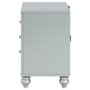Bring modern glam to a classic design with this transitional two-drawer nightstand. It features a glitzy design that draws the eye in any modern home. It's crafted with a vibrant silver metallic finish with fret work detail on the front panels and drawer fronts. The drawers are adorned with crystal-like pulls and the top one is lined with black felt. Dual USB ports and delicate bun feet complete the design of this exquisite accent piece. Key Features: • Two-drawer nightstand with silver metallic finish and mirrored trim accents • Front panels feature fretwork detail with crystal-like knobs on each drawer • Top drawer is felt-lined and includes dual USB charging ports for convenience • Clear sealer drawer boxes glide smoothly for accessible bedside storage • Stands on delicately shaped bun feet to elevate the refined design • Constructed from engineered wood, mirrored accents, and polyresin trim