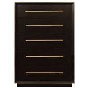 With five spacious drawers, this chest is convenient and versatile. Its large size is ideal for keeping your wardrobe organized. Its strong silhouette is enhanced by an attractive, smoked peppercorn finish. Its long, sleek drawer handles and outer frame are a lovely shade of gold, giving it an eye-catching touch of glamour. With a transitional design, this chest blends seamlessly with a variety of decor styles. Key Features: • Large, five-drawer chest ideal for wardrobe organization • Features a strong silhouette enhanced by a smoked peppercorn finish • Accented with long, sleek gold drawer handles and outer frame for a touch of glamour • Boasts a transitional design that blends seamlessly with various decor styles • Offers convenience and versatility with its spacious storage capacity