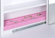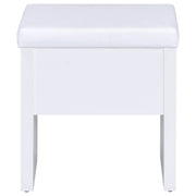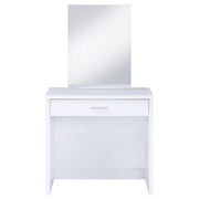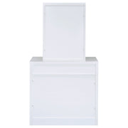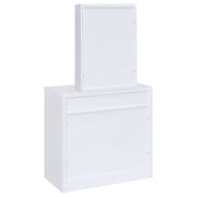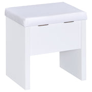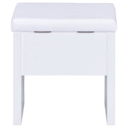 Contemporary white vanity looks great in a modern-style bedroom or dressing room and comes designed to hold your secrets better than a BFF. Pull-out drawer is spacious and compartmentalized for organization to get ready in a hurry (on those rare occasions). The large mirror slides open to reveal concealed jewelry storage compartments. Upholstered stool opens to reveal yet another storage area. This vanity truly is a woman's best friend. Key Features: • Modern three-piece vanity set with clean lines • Features storage mirror and one drawer • Slide-to-open mirror features jewelry hooks, two shelves, and ring storage • Flip-top storage stool with padded cushion upholstered in leatherette • Available in your choice of cappuccino with black leatherette or white with white leatherette
