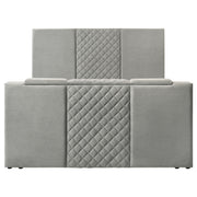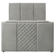 This bed is where elegance meets indulgence, inviting you to unwind in a world of luxury and innovation. A quilted velvet headboard adds a soft, sculptural presence, while the footboard conceals a motorized TV lift that glides open with a wireless remote. Designed to cradle screens up to fifty inches, it includes a discreet power outlet for seamless connectivity. Wrapped in plush velvet and framed in foam-padded wood, this bed redefines rest with a whisper of modern romance. Key Features: • Queen bed with quilted velvet headboard adds a soft touch to modern panel design • Velvet upholstery in grey contrasts with sleek black legs for a modern finish • Footboard features motorized TV lift supporting up to fifty-inch screen sizes • Wireless remote included for smooth, discreet media elevation and control • Built-in power outlet includes three AC outlets for convenient plug-and-play use • Engineered wood frame padded in foam supports mattress and box foundation
