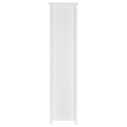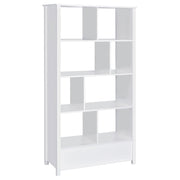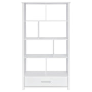 Asymmetrical shelves stack against one another to create this stunning, contemporary bookcase. A stylish, eye-catching addition to a home office, this minimalist bookcase invites you to organize office accessories or showcase decor and family photos. Eight separate sections divide items categorically if you wish, while a bottom drawer keeps items out of sight. The single drawer is adorned with a sleek, brushed zinc pull that further lends to the chic nature of this bookshelf. Versatile and functional, place this tall bookcase in the room of your choosing. Key Features: • Contemporary bookshelf with asymmetrical cubed layout and one storage drawer • White high gloss finish adds sleek shine and modern appeal • Eight open cubbies offer display space for décor and essentials • Lower drawer with silver pull stores smaller accessories out of sight • Engineered wood and laminate veneer construction provides durability • Compact profile fits home offices, bedrooms, or living rooms