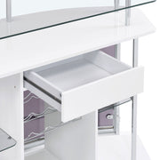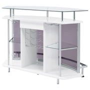 Chic with striking mixed material design, this contemporary bar unit elevates a modern style home. With a curved shape, this bar unit works perfectly in the corner of a media room or dining space, offering a place for guests to conjure together and serve themselves. A beautiful finish offers a classy touch and glam vibe, while a clear tempered glass top floats above, offering ample space to store barware and tumblers. Two smoked acrylic front panels showcase hanging stemware racks and libations, displaying what you have available. In addition, guests can slide up a stool or stand comfortably, resting along a steel footrest. Key Features: • Contemporary crescent shaped front bar unit in white high gloss lacquer finish • Clear tempered glass top and middle shelves with smoked acrylic front panels • Heavy gauge steel frame and footrest electroplated and polished in chrome • Single storage drawer with full extension glides • Features four rows of stemware racks and wine rack that accommodates twelve bottles • Constructed with MDF, steel, acrylic, glass, and engineered laminate • Also available in brown oak
