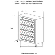 This five-drawer chest is ornately designed with French Provincial decor in mind. The perfect blend of traditional and modern, this upholstered chest comes in a gorgeous ivory and camel color. Button tufting makes this chest a masterpiece with its crystal-like accents. Tapered legs provide this chest with support while adding to the chest's aesthetics. Use the expansive tabletop for displaying decor. Key Features: • Five-drawer chest fully upholstered in ivory velvet with camel accents • Button-tufted drawer fronts include faux crystal buttons for a glam effect • Crystal hardware adds reflective sparkle and matches other case pieces • Champagne-finished tapered legs with capped feet add a refined base • Ample vertical storage perfect for wardrobe overflow or bed linens • Engineered wood structure with soft fabric overlay and foam cushioning