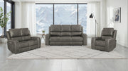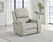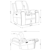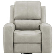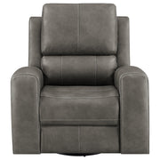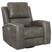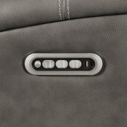 This triple power recliner chair invites you to unwind with motion, support, and quiet luxury. Wrapped in soft leatherette upholstery, it offers a supple touch that enhances every moment of rest. A gliding and swivel base flows effortlessly while plush cushions and contouring lumbar support cradle the body. Power headrest, lumbar, and recline functions adjust at your command. Hidden cup holders and built-in USB A and USB C ports add thoughtful convenience, while an emergency power-down port offers peace of mind. Key Features: • Triple power recliner chair with glider and swivel functions delivers motion-based comfort • Charcoal leatherette finish pairs with clean lines and deep channel-stitched back cushions • Power recline, headrest, and lumbar adjust easily with ergonomic control panel • USB A and USB C ports built into the panel for effortless device charging • Armrests conceal stainless steel cup holders for discreet beverage storage • Emergency power-down battery port provides added function during power outages