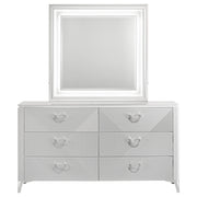 Sophisticated and dimensional, this six-drawer dresser and mirror set makes a bold statement in a high-gloss white finish. The dresser features geometric drawer fronts with fine ribbed texture forming inverted V patterns, paired with polished chrome U-shaped pulls. Black felt lines the top drawers for a touch of refinement, while 45mm metal extension glides ensure smooth operation. Above, the matching mirror glows with integrated white LED trim for ambient lighting and crisp contrast. Key Features: • Six-drawer dresser in white high gloss finish with sculpted geometric drawer fronts • Top drawers are fully lined in black felt to protect valuables and add a refined touch • Equipped with 45mm metal extension glides for smooth and quiet drawer operation • Polished chrome U-shaped pulls accent the textured surface with modern shine • Framed mirror includes integrated white LED trim for bright, ambient lighting • Crafted from engineered wood for a sleek and durable finish