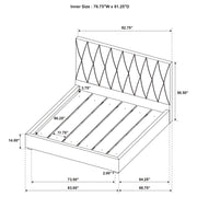 Graceful and grounded, this upholstered platform bed evokes a sense of quiet luxury. Draped in light brown velvet, its tall headboard rises like a statement piece, adorned with dramatic diamond tufting that captures light and shadow in elegant motion. The frame flows low and uninterrupted, inviting rest with its soft lines and serene presence. Black-finished legs peek subtly beneath, adding balance and contrast. With a built-in platform design, it offers lasting comfort and support without the need for a foundation. Key Features: • Queen platform bed with tall headboard and striking diamond tufting for sculptural impact • Light brown velvet upholstery delivers soft texture and neutral sophistication • Streamlined low-profile frame offers clean geometry and tailored form • Engineered wood platform panels support mattress directly with no foundation required • Contrasting black legs enhance the silhouette with grounded visual balance • Crafted from Asian hardwood, engineered wood, foam, and velvet upholstery