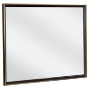 Geometric features from this California king four-piece bedroom set transform a modern setting. Warm and full of depth, the high headboard features upholstery and a smoked peppercorn finish. Complete with ample storage, this set has a nine-drawer dresser and two-dresser nightstand and included shelf. Welcome structure from the silhouette and personality from the retro inspired details. Dress up the dresser with the clean and elongated mirror.
