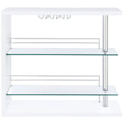 If you love to entertain, you'll love the charm and convenience of this fabulous, contemporary bar unit. With a sleek, stylish design, it looks elegant in a dining area or recreation room. Complete with a gorgeous gloss black finish and shining chrome accents, its bold silhouette makes a striking statement. This handsome unit includes two glass storage shelves for wine, glassware, and bar accessories. A handy wine glass holder rounds out its versatile appeal. Key Features: • Smaller footprint makes this contemporary bar unit a hit • Elegant, clear tempered glass shelves provide strength • Two (2) glass shelves with guardrails and stemware racks add storage and protect the stored items • Steel, MDF, particle board, and laminate construction • Choose from glossy black, glossy cappuccino, glossy white, or weathered grey