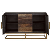 A handcrafted accent cabinet from India makes its presence known. With its mix of natural wood colors, it'll instantly captures attention in your living area. Gold hardware with a matching geometric base provides durability and aesthetic flair. Two large cabinet doors hold your valuables within. Neatly arrange your items on the single interior shelf. Key Features: • Handcrafted from sheesham and acacia wood with artistic wood grain • Gold metal base and handles add sleek contrast to natural tones • Two cabinet doors open to a single interior shelf for storage • Painted doors enhance the cabinet’s unique appearance • Ideal for entryways, living rooms, or dining areas • Made in India and constructed from solid wood, engineered wood, and metal