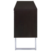 Extend the utility of an office desk with this beautiful credenza. Built with a linear silhouette, its minimalist design is flattering to a contemporary office. Cappuccino brings a dramatic finish. Metal u-shaped legs and hardware add perfect finishing touches. Storage and utility are top-notch with a top drawer, an open shelved compartment. and two file drawers. Key Features: • Classy office desk in cappuccino finish • Clean metal base in silver finish • Credenza features expanded space with three (3) storage drawers, two (2) file cabinets, and an open storage compartment with an adjustable shelf • File cabinet holds both legal and letter size files • Metal, MDF, particle board, and laminate construction