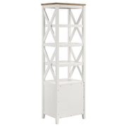 Enhance your TV viewing experience with this versatile entertainment center that combines rustic farmhouse, coastal, and cottage styles. The brown ash veneer top and contrasting white frame with antique silver knobs create a charming look. Ample storage and display space make it practical, while the durable construction ensures longevity. The symmetrical X-trellis media towers on each side add a unique touch of style.