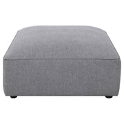 The minimalist design and sophisticated tailored look elevate this contemporary grey ottoman. The large, oversized, boxy shape is upholstered in a soft grey woven fabric that lends it a hint of texture. With a neutral monochromatic color palette, this ottoman slips into existing decor effortlessly. With a smooth, wide top, it welcomes a tray table of snacks and refreshments and doubles as a coffee table. Petite black legs beneath give it a slight lift off decorative rugs and flooring.