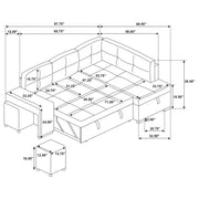Effortlessly blending beauty and utility, this sleeper sectional invites you to unwind in tailored comfort. Draped in soft grey fabric, its tufted cushions exude quiet elegance, while the generous silhouette offers space to stretch, gather, or dream. Two upholstered stools nest neatly within the armrest, ready for extra seating in an instant. A pull-out bed welcomes overnight guests, and the chaise conceals spacious hidden storage—perfectly designed for life lived beautifully. Key Features: • Sleeper sectional sofa with tufted cushions and clean lines for stylish relaxation • Grey fabric upholstery brings soft texture and versatile modern charm • Pull-out sleeper bed transforms the sofa into a cozy guest accommodation • Lift-up chaise conceals hidden storage for blankets, pillows, or everyday needs • Includes two upholstered stools that nest seamlessly into the sofa armrest • Perfect for compact spaces needing elegant form, comfort, and flexible seating