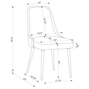 Elevate your dining experience with the stunning five-piece dining table set that seamlessly blends modern elegance with mid-century charm. The 71-inch dining table features a sleek black ceramic top with delicate white striations, creating a marble-like masterpiece perfect for any stylish home. Complementing this table are four upholstered side chairs, each wrapped in sophisticated grey fabric and supported by tapered gunmetal legs for a contemporary touch. This set promises to be the centerpiece of your dining room, offering both ample seating and unparalleled style. Transform everyday meals into extraordinary moments with this exquisite dining ensemble.