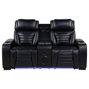 Designed for modern comfort and convenience, this dual power loveseat blends technology with bold styling. Power recline and adjustable power headrests offer personalized relaxation, while the center console features a lift-top compartment, two cup holders, and a built-in Bluetooth speaker for seamless audio. Finished in sleek black leatherette with dramatic LED under glow, it brings smart design to any contemporary lounge or home theater. Key Features: • Dual power loveseat in black faux leather with power recline and power headrest control • Center console includes lift-top storage, two cup holders, and built-in Bluetooth speaker • Both sides feature control panels with USB-A, USB-C ports, and one-touch home buttons • Sleek padded arms with cup holders add comfort and convenience to every seat • Blue LED under glow lighting enhances the base with a bold modern ambiance • Upholstered in smooth leatherette with deep channeling for comfort and visual depth