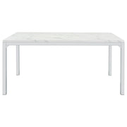 Dress up a dining room with striking, modern opulence. This gorgeous, contemporary dining table flaunts a smooth, white, marble top for a luxurious design that's sure to impress. The table base is made with top-quality metal in a gleaming chrome finish that shines in the light. From everyday dinners to elaborate feasts, the rectangular surface provides all the space you need for family dining enjoyment. Surround this modern table with your favorite chairs to complete a formal dining room in style. Key Features: • Rectangular dining table with spacious top and modern linear frame design • Faux Carrara marble finish adds a refined look with subtle veining across the surface • Sleek chrome metal legs provide sturdy support with high-shine appeal • Clean edges and minimalist profile complement contemporary dining spaces • Made from engineered wood with durable PVC laminate and metal framing • Assembly required with smooth finish ideal for both casual meals and formal occasions