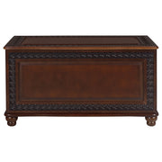 This traditional cedar chest offers timeless design and practical storage with a flip-open top supported by a child safety hinge. Finished in deep tobacco, it features carved detailing, turned feet, and rich visual contrast. Constructed from rubberwood, engineered wood, and basswood veneer, the fully cedar-lined interior naturally repels pests, absorbs moisture, and preserves the freshness of stored textiles. Ideal for storing linens, keepsakes, or seasonal essentials. Key Features: • Cedar chest with classic rectangular silhouette and turned bun feet for a traditional profile • Deep tobacco finish pairs with carved inlay trim for rich, timeless visual appeal • Flip-open top features a child safety hinge for smooth and secure access • Fully cedar-lined interior helps resist moisture, moths, and odors naturally • Made from rubberwood, engineered wood, and basswood veneer for durability • Perfect for storing blankets, keepsakes, or seasonal items in bedrooms or entryways