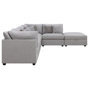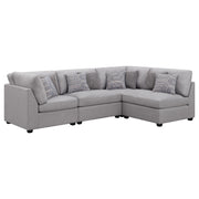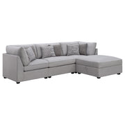 This modular sectional sofa embodies contemporary comfort with clean lines, inviting textures, and customizable flexibility. Upholstered in soft grey fabric, it features supportive cushions wrapped in plush feather-down for an indulgent seating experience. Subtle wedge details and tapered block feet lend modern refinement, while the modular design allows each piece to adapt effortlessly to any space. Perfect for family gatherings or relaxed lounging, it delivers style, durability, and lasting comfort in one cohesive design._x005F_x000D_ Key Features: • Modular sectional sofa with soft grey upholstery offers modern style and plush comfort • Configurable design allows flexible seating layouts for any living room arrangement • Hidden storage ottoman adds versatility for blankets, pillows, or everyday essentials • Plush feather-down wrapped cushions deliver inviting comfort and long-lasting support • Tapered block feet and subtle wedge details enhance its contemporary refined profile • Perfect for relaxing, entertaining, or family gatherings in a cozy modern setting