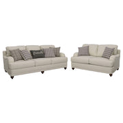 Taking a page from cottage-style farmhouse ambiance, this two-piece sofa and loveseat set wins over family and guests with its elegant simplicity. With tailored English arms and turned legs offering a contrasting espresso finish, each piece of this set shines with a light grey linen-like upholstered cover. Reversible cushions with T-cushions on each end create comfort and stay in shape, as a solid wood frame with a sinuous spring deck sets the stage for durability. Attached back cushions remain stationary to prevent shifting. Enjoy the designer look of seven accent pillows with varying blue print covers. Key Features: • Bring LOVE to your living area with this sophisticated farmhouse collection • Tailored English arms • Turned legs in espresso • No rearranging required with easy to maintain attached back cushions • Extend the life of your upholstery set with reversible seat cushions