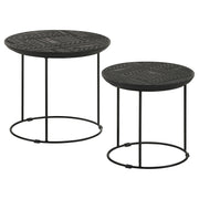 Add a modern rustic touch to your space with this two-piece nesting table set, designed for style and function. Crafted from eco-friendly solid mango wood, the embossed tribal-inspired ink blot pattern on the round tabletops adds a textured global aesthetic. Supported by slim black iron bases with a cage-like silhouette, these tables offer an airy and lightweight feel. Ideal for small spaces, the smaller table conveniently nests under the larger one, making it perfect for versatile living areas. Whether used together or separately, this contemporary set blends organic charm with industrial edge.