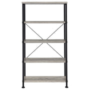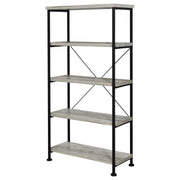 Embrace a traditional look with contemporary upgrades. Choose this bookcase to organize accents and books in a transitional space. Minimalist styling reflects a classic dynamic reflecting a hint of industrial aesthetics. Find plenty of room on four side shelves to display books and decor. Select from finishes that suit your space. Key Features: • Double bookcase with four extra-wide tiers for ample display and storage space • Rustic nutmeg finish offers a warm wood tone with industrial character • Black powder-coated steel frame enhances contrast and structural stability • Crossbar detailing on the back reinforces support without adding bulk • Open shelf design keeps contents visible and accessible from all sides • Made from engineered wood, melamine paper, and heavy gauge metal