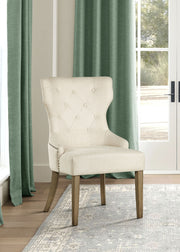 Enjoy an intriguing silhouette with a classic look. Graceful curves and angles form an eye-catching design in this dining chair. Perfect for transitional spaces, its modern design is softened with lovely beige upholstery and tufting on its seat back. Individually hand-applied nailhead trim infuses charm and style. Beautifully contrasting legs in a warm brown finish add a balanced look with curves and tapers. Key Features: • Enjoy a classic silhouette with graceful curves and angles for an eye-catching design • Perfect for transitional spaces, modern design softened with beige upholstery and tufting on seat back • Individually hand-applied nailhead trim infuses charm and style • Contrasting legs in warm brown finish add a balanced look with curves and tapers • Ideal for any room, this chair is sure to make a statement