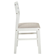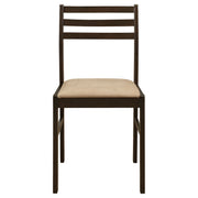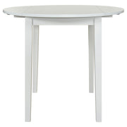 This lovely dining set lends an elegant touch of simple sophistication to a kitchen or breakfast nook. It comes complete with a lovely, round dining table and two comfy chairs upholstered in soft, light brown, padded fabric. The table is enhanced by a versatile drop-down extension which can be raised to accommodate an elaborate dining setup. Lowering it allows you to cozy up closely with a special someone over a leisurely breakfast or romantic, candlelit meal. A smooth, polished, natural wood finish gracefully complements the sleek, stylish silhouette of this beautiful three-piece set. Key Features: • Light and airy natural finish dining set is perfect for a casual breakfast nook • Round table with drop down leaves saves space • Chairs feature a contemporary rendition of a ladder back style • Padded seats in tan microfiber • Sold as a three piece all-inclusive set: Table plus two chairs