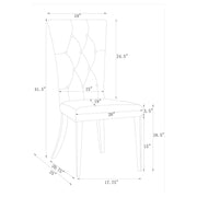 Host a party at this sophisticated modern glam dining table set, designed with a gorgeous polished chrome finish across its demilune pedestal base and four slender dining chair legs. The spacious rectangular table top presents a faux marble top and seats four comfortably and offers plenty of space for family and friends. Slide up in a Parson style dining chair, upholstered in a luxurious velvet fabric that offers a contemporary flair and soft look and feel. Button tufted backrests fan out toward the top, offering a modern expression to their classic silhouettes. Lastly, a beveled edge surrounds the table top, presenting a hint of intricate texture to the sleek aesthetic.