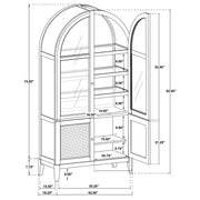 Transform your dining area into a sophisticated and functional space with this complete dining set, featuring a counter-height table, matching chairs, and a stunning vitrine display cabinet. The table is crafted from solid wood, engineered wood, and oak veneer, with a smooth rectangular top and rounded edges for a refined, elegant look. Its base includes a built-in two-door cabinet, perfect for storing dining essentials. The matching counter-height chairs are designed with hand-woven radio weave cane backrests and foam seat cushions upholstered in soft beige fabric, offering both comfort and style. Completing the set is the vitrine display cabinet, featuring wood-framed tempered glass doors and hand-woven cane accents on the lower section. With four tiers of shelving and a concealed storage section, this cabinet provides a stunning way to display your finest dinnerware or collectibles. This dining set blends natural beauty, craftsmanship, and practical storage, creating a complete and cohesive dining experien
