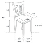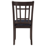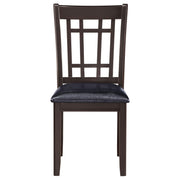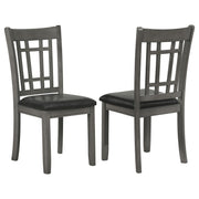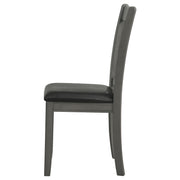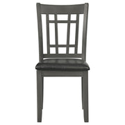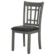 A combination of vertical and horizontal slats creates a window pane effect for this charming transitional dining chair. An armless silhouette is a versatile choice for relaxed, everyday living. The chair boasts a medium grey finish over rubberwood construction. Webbed seating and black faux leather upholstery combine for stylish comfort. Invite friends and family to have a seat and enjoy a lovely meal. Key Features: • Dining side chair with open grid backrest and gently curved back support • Medium grey finish highlights transitional styling and natural wood texture • Black faux leather upholstered seat provides cushioned comfort and easy care • Seat constructed with webbing and frame support for long-lasting durability • Armless profile allows for flexible seating arrangement around any table • Crafted from solid hardwood, engineered wood, and foam-padded leatherette