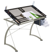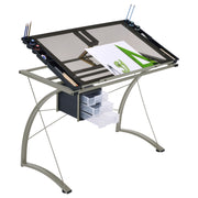 Contemporary attitude shines positive light on this fabulous drafting desk. With curves and linear elements, it creates an enticing look. Enjoy luscious champagne finish steel and a smoke tempered glass top. Find space to stash essentials in a pencil ledge, three drawers, and a variety of storage compartments. This elegant, versatile desk brings a light, airy flavor to a home or business office. Key Features: • Drafting table with adjustable smoked glass top and silver metal frame • Curved metal legs and crossbars enhance structural stability • Includes retractable pencil ledge, three drawers, and storage trays • Tempered glass surface supports drawing, tracing, and design work • Plastic drawer stack adds organizational utility beneath the desk • Perfect for creative spaces, art studios, or multi-functional use
