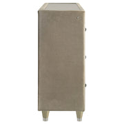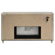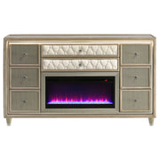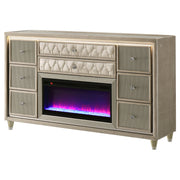 Infuse your space with cozy glamour in this eight-drawer flame box dresser, richly upholstered in ivory and camel velvet. A built-in LED flame visualizer is framed by clear tempered glass and acrylic details, while crystal knobs and quilted velvet drawers shine with elegance. LED case lighting and a wireless remote enhance function, while brown felt-lined top drawers, dovetail joints, and heavy-duty glides provide strength and finesse atop solid rubberwood legs. Key Features: • Eight-drawer dresser with built-in flame visualizer (no heat) and wireless remote control • Upholstered in ivory and camel velvet with acrylic details for glam appeal • Clear tempered glass top offers sleek protection and elegant shine • LED lighting traces the case to highlight its sculptural soft glam form • Felt-lined top drawers, dovetail joints, and heavy-duty glides for daily use • Supported by solid rubberwood legs with solid and engineered wood construction