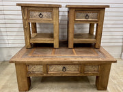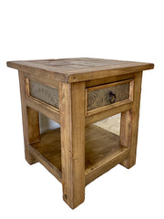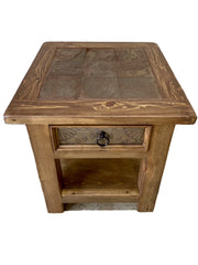 Fancy Tin End Table Our Cabinet is a beautiful piece of rustic furniture, handcrafted in Mexico from kiln-dried pine wood. This cabinet features a decorative tin inlay on its front door, showcasing intricate designs that add an element of elegance to any room. Inside, spacious shelves await your belongings, offering both organization and display space.