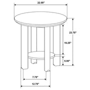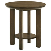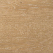 Gracefully curved and richly grounded, this end table brings sculptural elegance to any living space. A smooth, round top floats above four cylindrical legs, creating a gentle rhythm of form and function. Below, a low circular shelf adds space for cherished objects or everyday essentials. Crafted from solid wood, engineered wood, and white oak veneer, this accent table offers quiet strength and warm simplicity beside any chair, sofa, or reading nook. Key Features: • Round end table with sculpted legs and shelf for functional and balanced living room use • Washed oak finish brings soft tone and subtle wood grain to the circular surface and shelf • Cylindrical legs add visual structure and grounding to the smooth round profile • Lower open shelf offers added space for books, décor, or small storage baskets • Crafted from rubberwood, engineered wood, and white oak veneer for strength and warmth • Ideal as an accent or side table for relaxed spaces with casual modern appeal