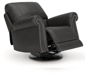 Everyone can have the best seat in the house with this swivel glider recliner. Its nailhead trim puts the finishing touches on the traditional roll arms you love. The recliner's comfy, durable cushions—wrapped in a rustic yet sophisticated faux leather—keep you feeling relaxed, while its turned legs show that style and quality flow from top to bottom. Plus the smooth reclining motion and 360-degree swivel keep you in the flow of conversation.