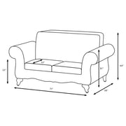 Bring robust design and a veritable tapestry of color and pattern to your living room with this traditional loveseat. It stands out with dramatic rolled arms augmented with smooth dark brown faux leather that adds depth and contrast to coordinating fabrics. Seat cushions feature light brown, while back pillows are patterned in complementary hues, offering refined flair for your sitting area. A pair of accent pillows complete the plush look, complete with fringe trim that mirrors the back pillows. The front and arms are further augmented with carved details, offering a loveseat that ensures a rich, refined ambiance. Key Features: • Traditional loveseat with an ornate design is rich in depth and detail to create a true focal point • Ornate carvings add character and artisan flair to wood frame details and curvy legs • Rolled arms feature dark brown faux leather upholstery for a chic, smooth touch • Cushions, back and accent pillows highlight three different upholsteries for a rich tapestry • Seats feature sinuous springs for optimal comfort and support you can rely upon for years to come