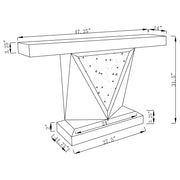 This mirrored console table features a sleek rectangular design with a bold, geometric base. The triangular inlay is adorned with acrylic crystals, enhancing its modern appeal. Made with mirrored surfaces, the console offers a sophisticated look that reflects light beautifully, adding elegance to any room. Crafted with durable materials, it provides a sturdy foundation while its clean lines create an eye-catching focal point in your home. Key Features: • Mirrored console table with a bold geometric design and acrylic crystal inlay • Triangular acrylic crystal inlay adds a touch of sparkle and sophistication • Crafted with mirrored surfaces that reflect light for an elegant, modern look • Solid base construction ensures stability and long-lasting durability • Sleek rectangular tabletop provides ample space for decorative items • Ideal for use in hallways, living rooms, or entryways as a statement piece
