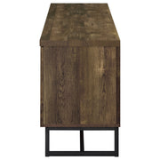 This rustic TV console offers a modern touch to a farmhouse style living room. A rustic oak finish showcases the classic herringbone pattern across the double cabinet doors. Supported on a metal trestle base in a gunmetal finish that offers an industrial flair, this TV console offers plenty of support while lifting the furniture piece over a rug and offering extra space beneath for baskets and organization. Inside each cabinet is a single adjustable shelf that may be lowered or raised as needed. In the center of this console are two open shelves for a gaming console and other entertainment systems. Key Features: • Rustic with a modern touch • Herringbone patterned door fronts • Functional storage with adjustable shelves • Metal leg base finished in a gunmetal powder coat • Constructed with particle board, engineered veneer, hollow board and metal