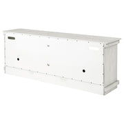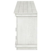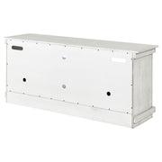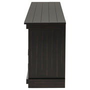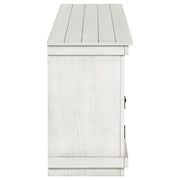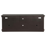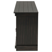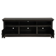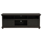 Complete a media center in your inviting home with a modern farmhouse TV stand. It's an approachable design with roughhewn wood details that create texture and dimensionality in your living space. Two shelves and six compartments create ample storage, perfect for everything from peripherals and accessories to personal decor. The media console features a clean-lined silhouette with a slim profile, perfect for a flat panel or wall-mounted television. This TV stand accommodates televisions up to 65 inches. Key Features: • Roughhewn wood markings add artisan character to a modern farmhouse TV stand • A distressed finish lends casual farmhouse character in your den or living room • Two open shelves provide space for media and gaming peripherals and decor • Six compartments storage that's perfect for accessories and media like games and controllers • A slim, straight-lined silhouette supports a flat panel television up to 65 inches