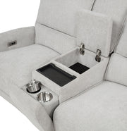 This reclining loveseat captures the essence of cozy sophistication, designed for shared moments and quiet indulgence. Outfitted in plush dove grey chenille, its smooth, sculpted form invites relaxation at the push of a button. Dual power recliners extend effortlessly, controlled by integrated side buttons, while a center console with hidden storage and cup holders adds functional ease. Built atop a sturdy wood and metal frame, it offers enduring comfort for two. Key Features: • Power reclining loveseat with sculpted seats and plush cushioning for two • Dove grey chenille upholstery adds softness and a contemporary neutral palette • Dual push-button recliners offer smooth electric motion on both sides • Center console includes hidden storage compartment and dual cup holders • Anti-pinch mechanism pauses recline when contact is detected for added safety • Foam-padded seating and backrests wrapped in soft polyester chenille