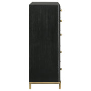 Enhance storage and style in your bedroom with a modern five-drawer chest. Impeccably designed, it features a classic silhouette complete with rounded corners that create a softened effect perfect for a soothing space. The chest offers five drawers for easy and accessible storage, and each is decorated with a pair of petite round knobs in a golden finish. A crisp black finish is wire brushed to create texture, enhancing the wood grain look of this chest. Gold finish legs match the hardware for a cohesive look and the top is perfect for decor.