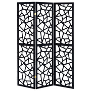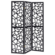 Make a bold statement in any space with this 3-panel room divider, featuring an eye-catching mosaic cutout pattern that enhances modern and mid-century décor. The sleek black finish creates a striking contrast, while the open geometric design allows light to pass through, maintaining an airy and spacious feel. Crafted with a durable solid wood frame, this partition is perfect for separating spaces, adding privacy, or serving as a decorative accent. Its folding trifold design offers versatility, making it easy to reposition as needed. Key Features: • Three-panel room divider with a bold open mosaic pattern for modern appeal • Sleek black finish enhances contemporary and mid-century décor • Trifold folding design allows for flexible room separation and styling • Crafted with durable engineered wood and FSC-certified pine for stability • Ideal for privacy, open-space definition, or as a stylish decorative accent • Light-filtering cutout pattern maintains an airy and open feel