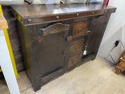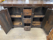 The 48β Gothic Buffet is crafted from solid pine wood and features a bold, rustic design with distinctive character. The dark stained finish highlights the natural wood grain, while the metal-accented top with decorative rivets adds a strong, industrial-gothic touch. This piece offers functional storage with two cabinet doors and three center drawers, all accented with rustic iron ring hardware. Sturdy construction and timeless styling make it a perfect addition to dining rooms, kitchens, or living spaces with rustic, Gothic, or hacienda-style dΓ©cor.