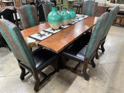 The set includes six premium leather dining chairs, designed with padded leather seats for comfort and high-back silhouettes upholstered in a green embossed leather with decorative nailhead trim. The combination of copper, leather, and solid wood creates a striking look ideal for rustic, Western, or Old World–inspired dining spaces.