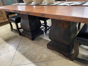 This Hammered Copper Dining Set is a bold statement piece that blends rustic craftsmanship with upscale materials. The spacious table features a hand-hammered copper tabletop, showcasing rich texture, natural patina variations, and warm copper tones that make each piece one of a kind. It is supported by solid wood pedestal-style bases, offering exceptional stability and a strong architectural presence.